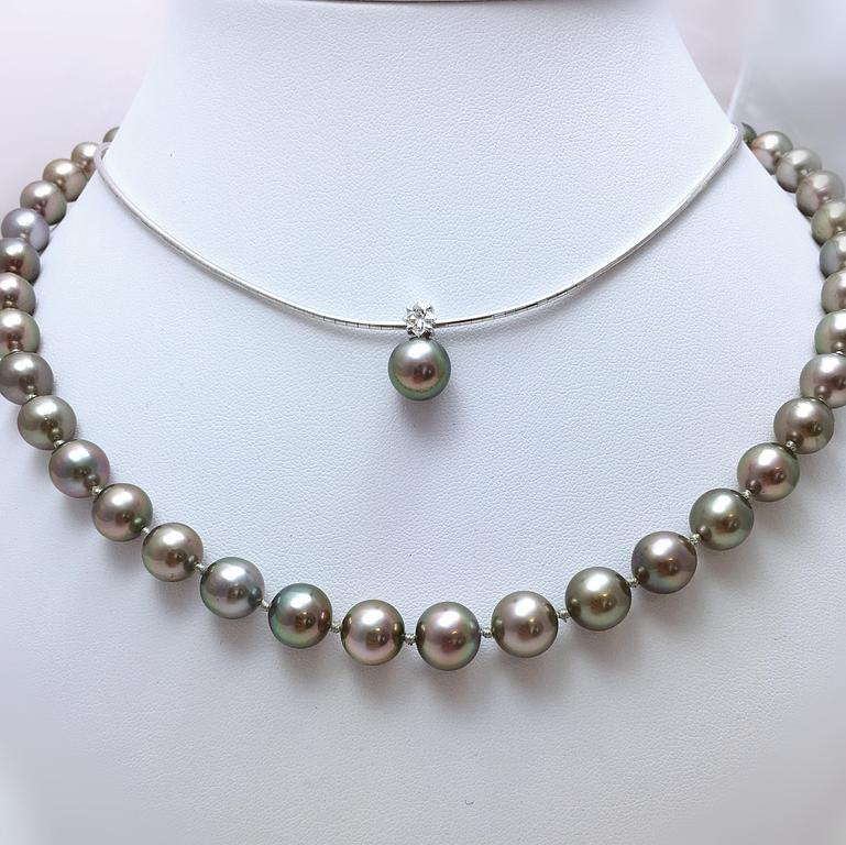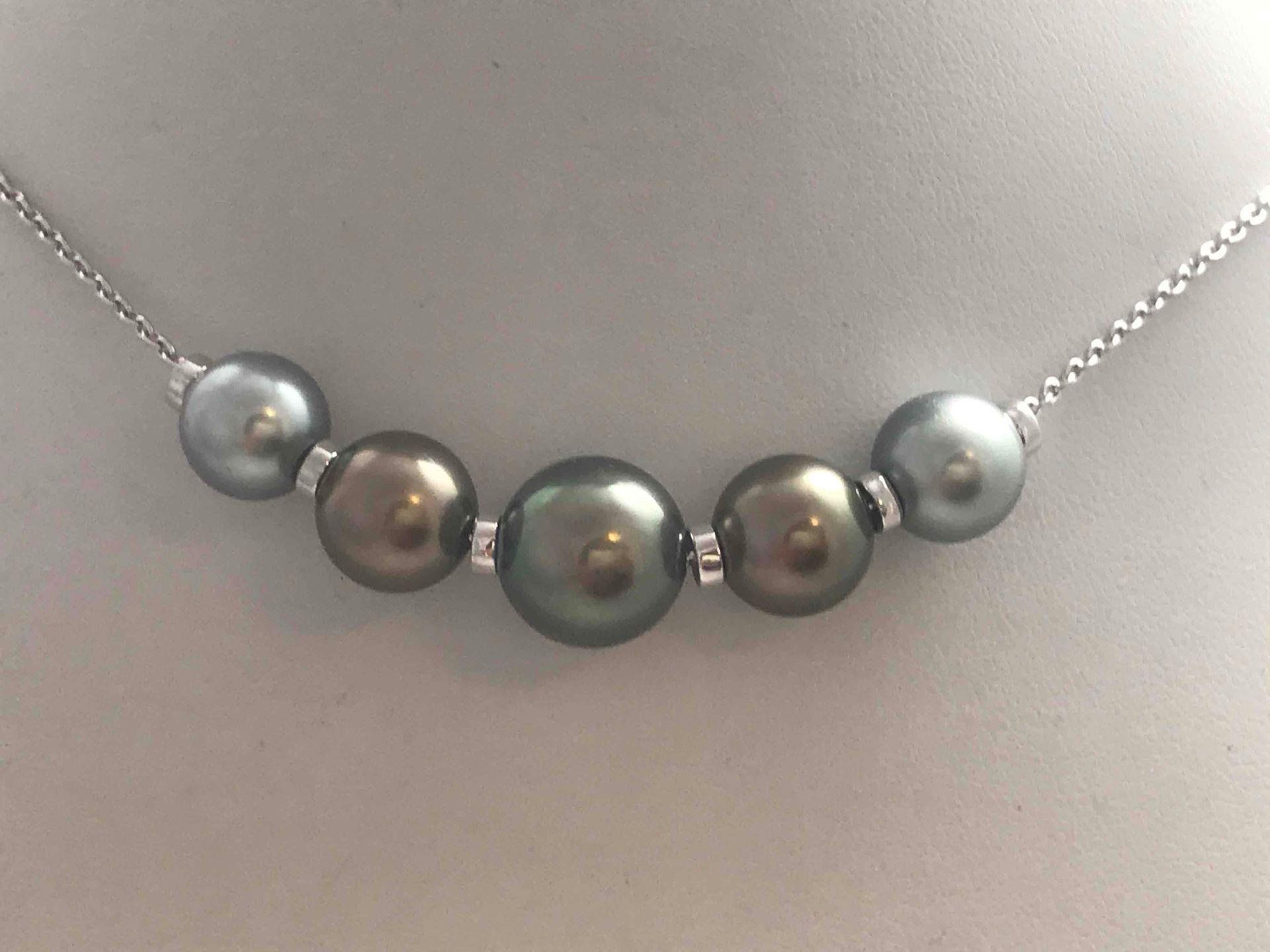 Collier de perles de Tahiti montées sur chaines en or blanc 750 millième avec intercalaires en or blanc 750 millième.