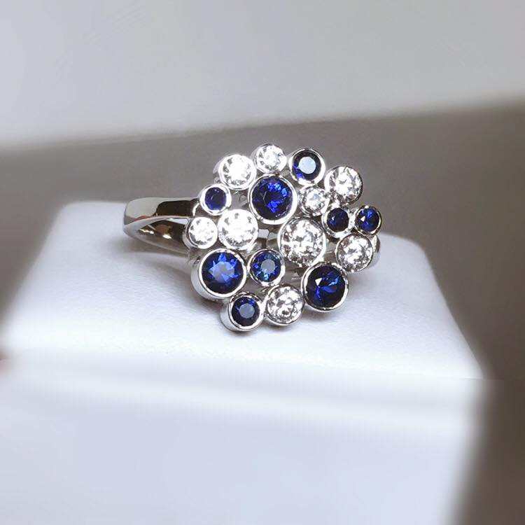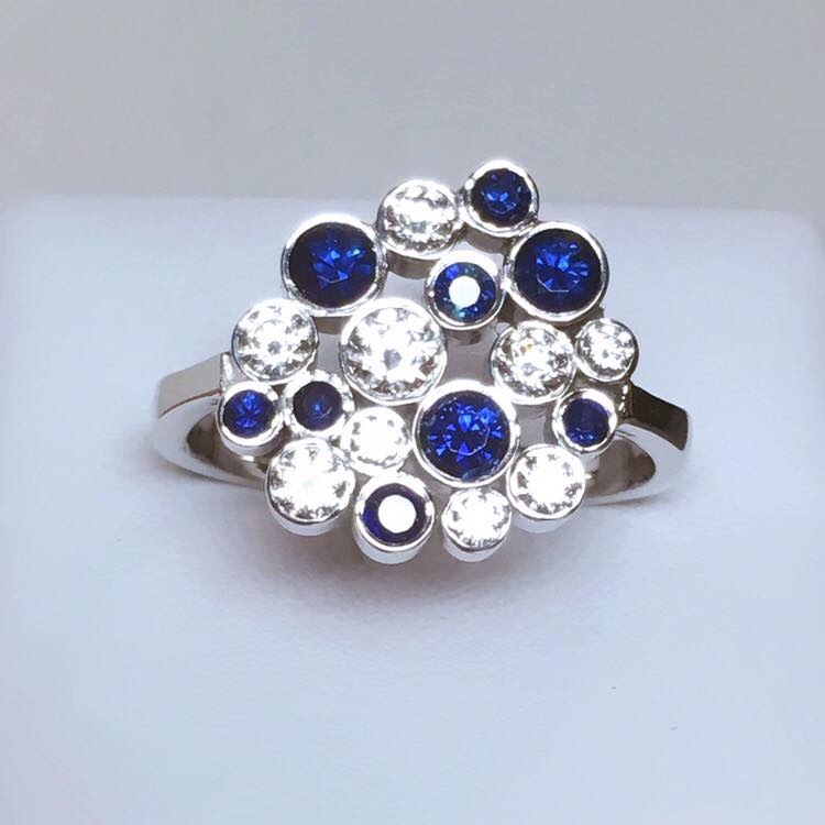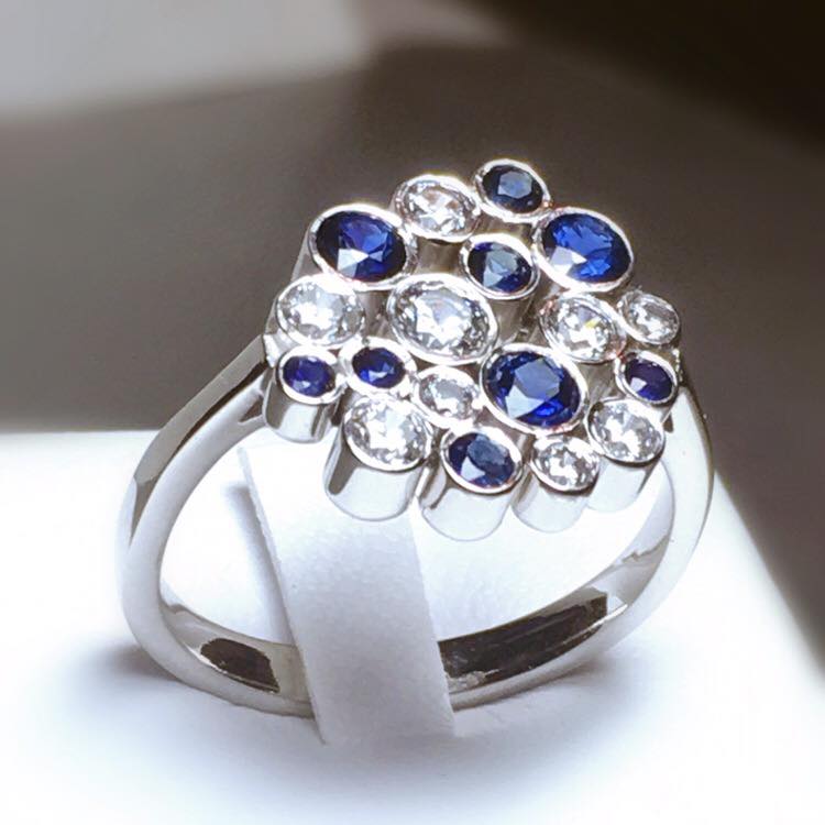 Bague en or blanc 750 millième, sertie d'oxydes de zirconium et de saphirs.