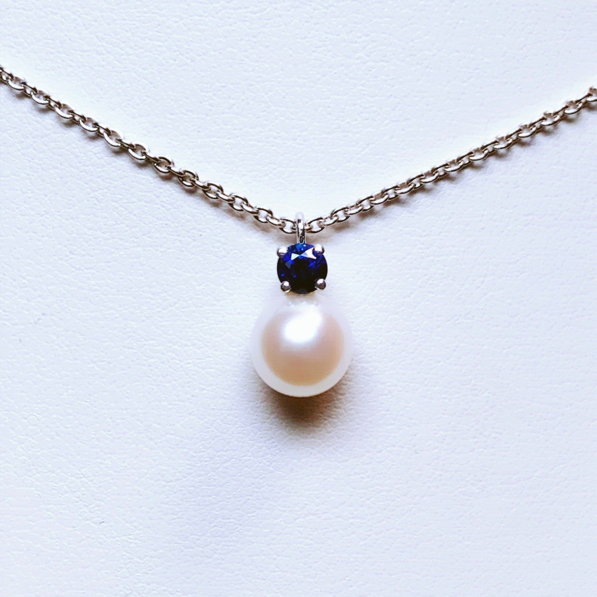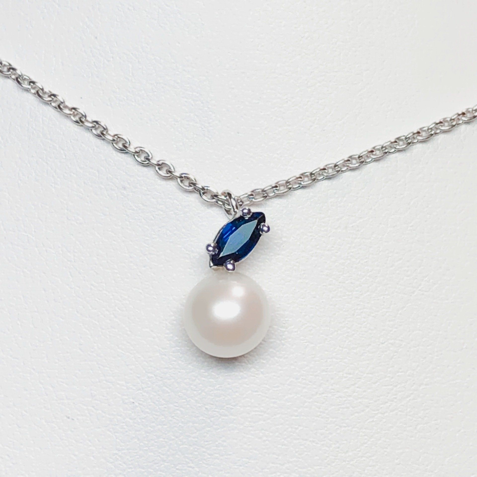 Collier en or blanc 750 millième, perle de culture d'eau douce et saphir.