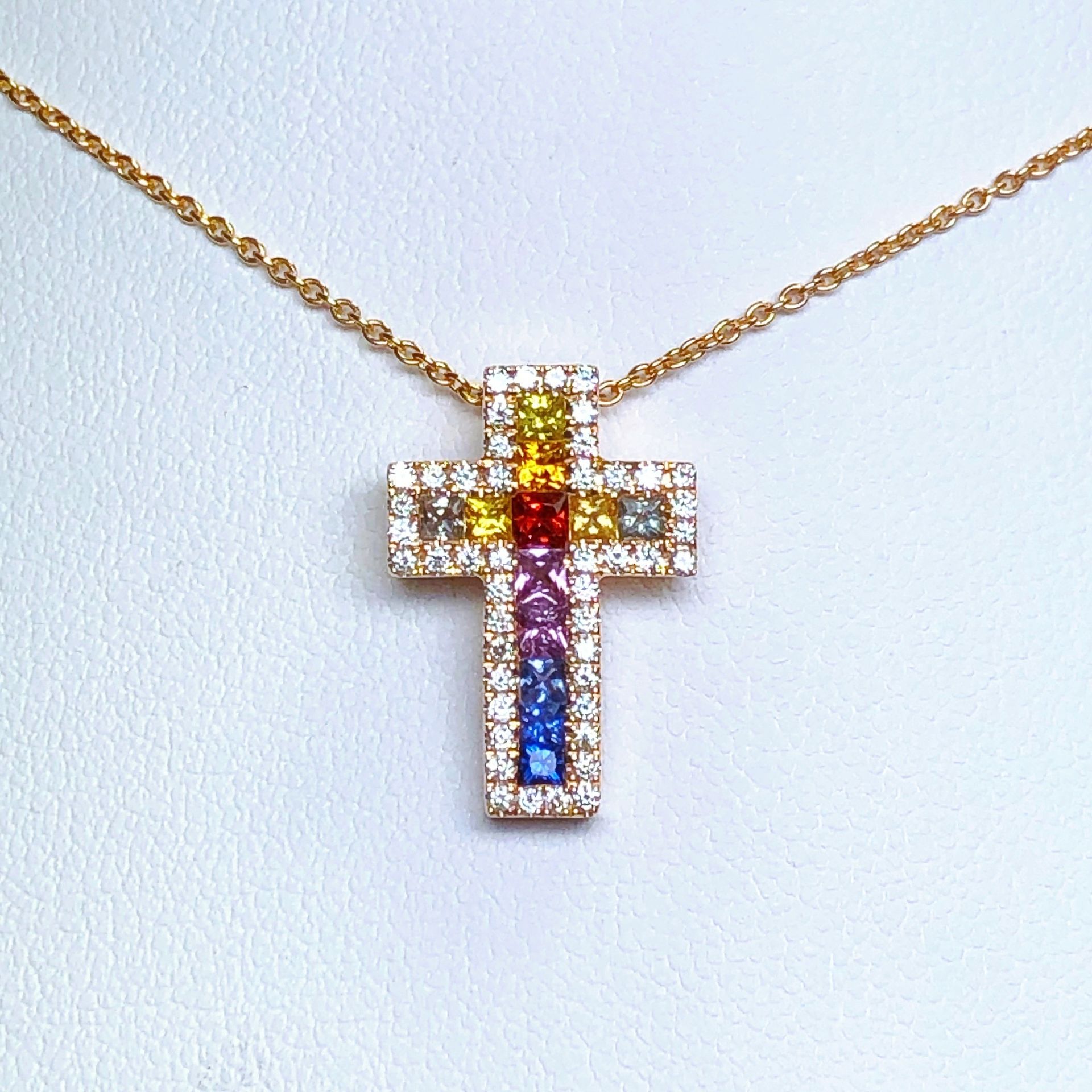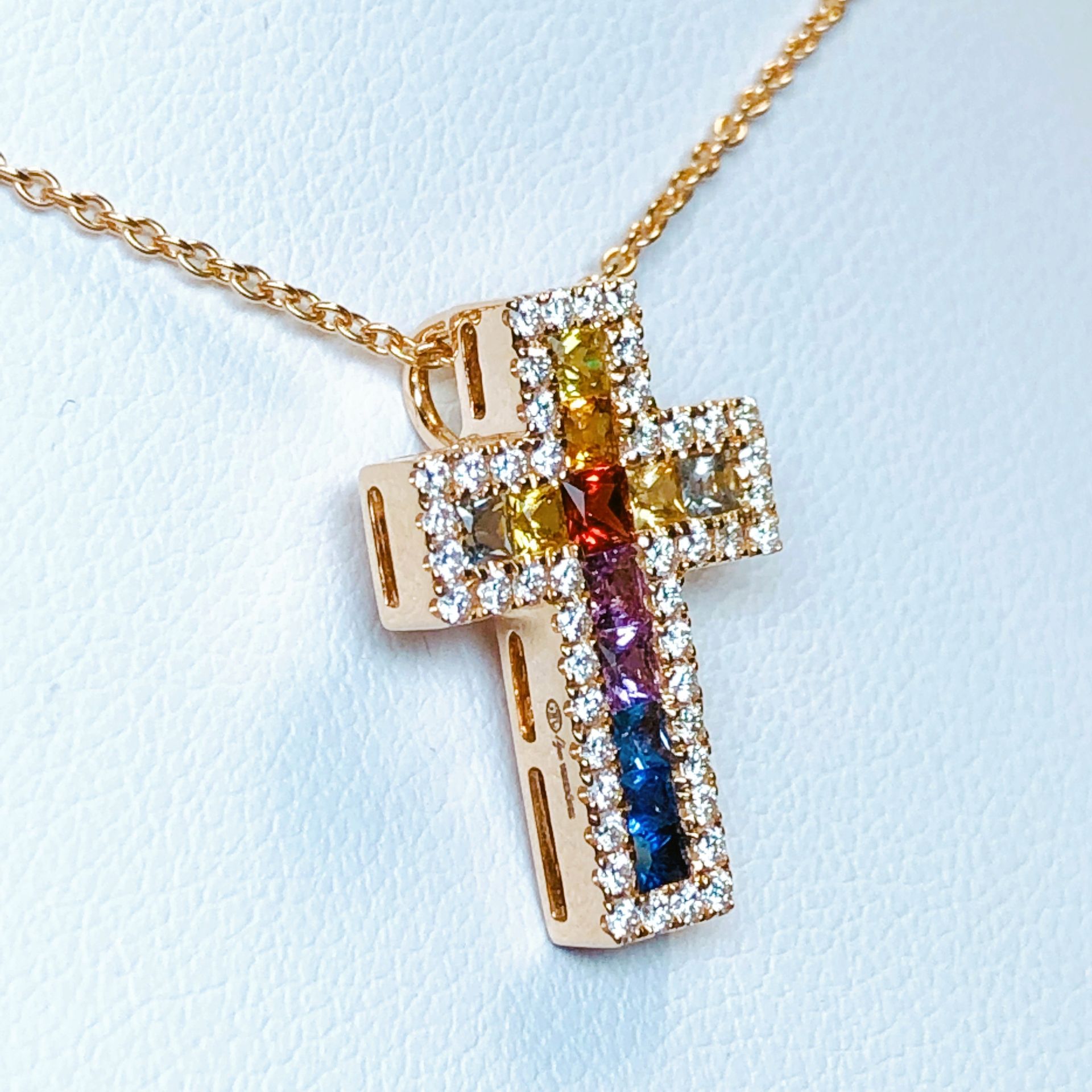 Croix en or rose, sertie de diamants et saphirs de couleur.