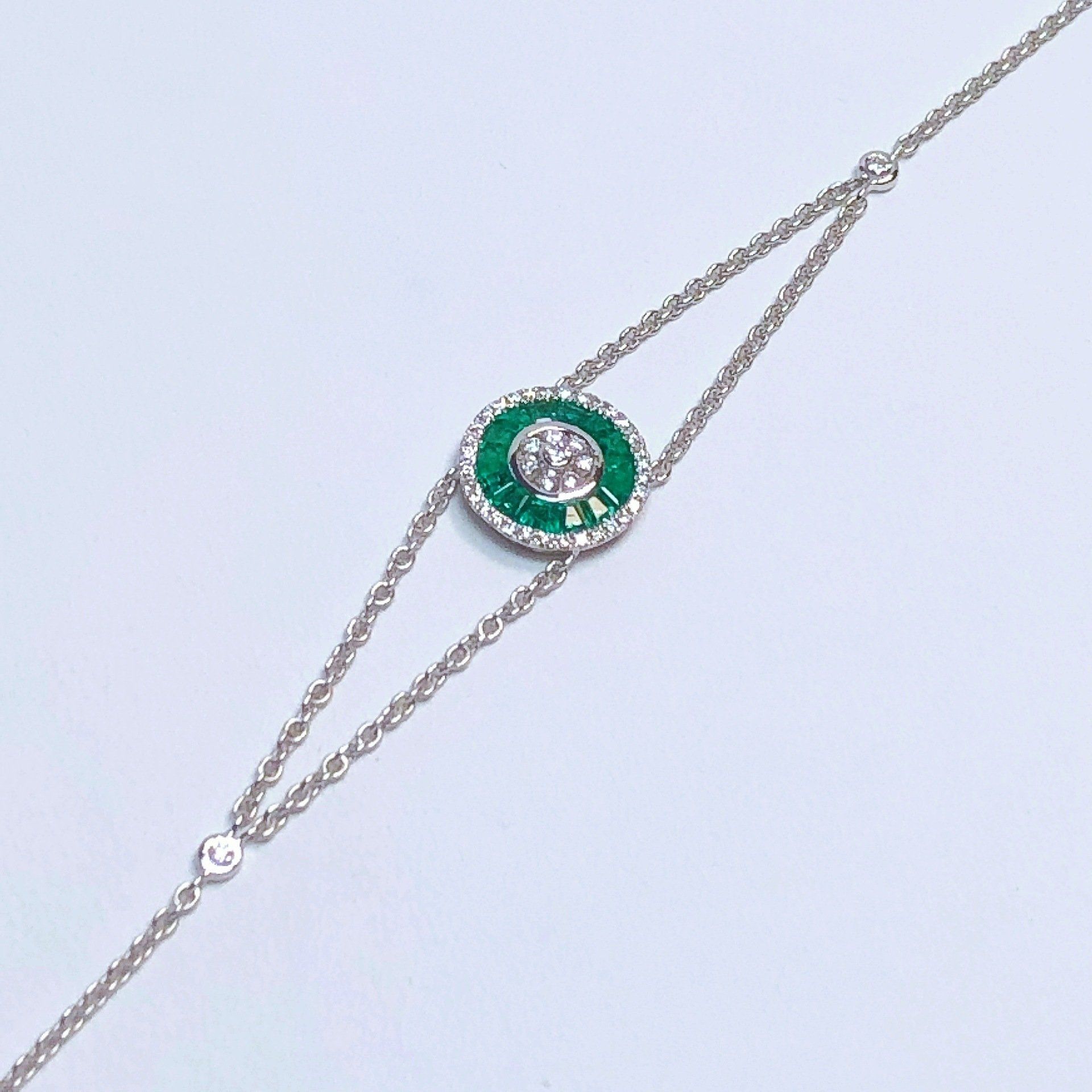 Bracelet en or blanc 750 millième, serti d'une émeraude et de diamants.