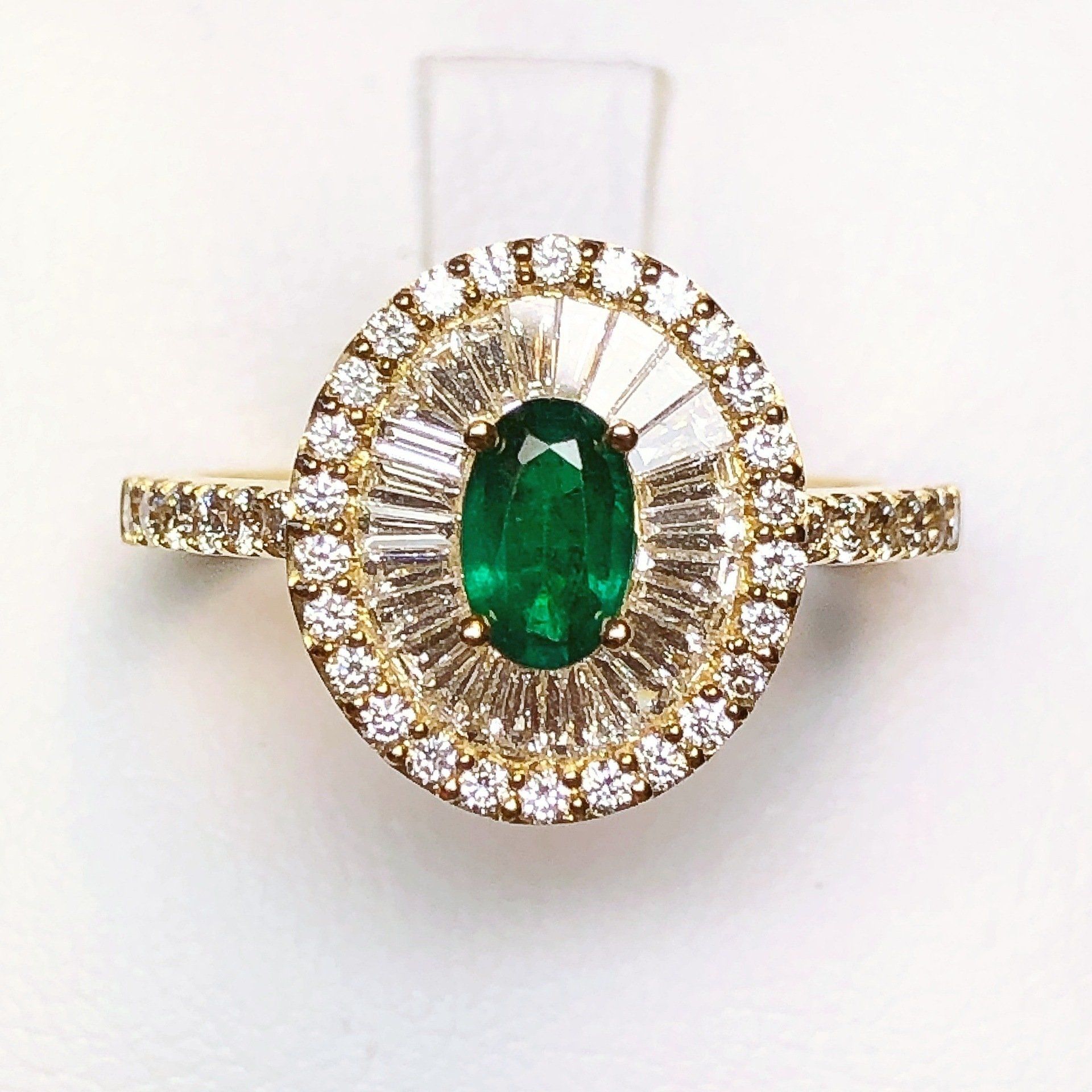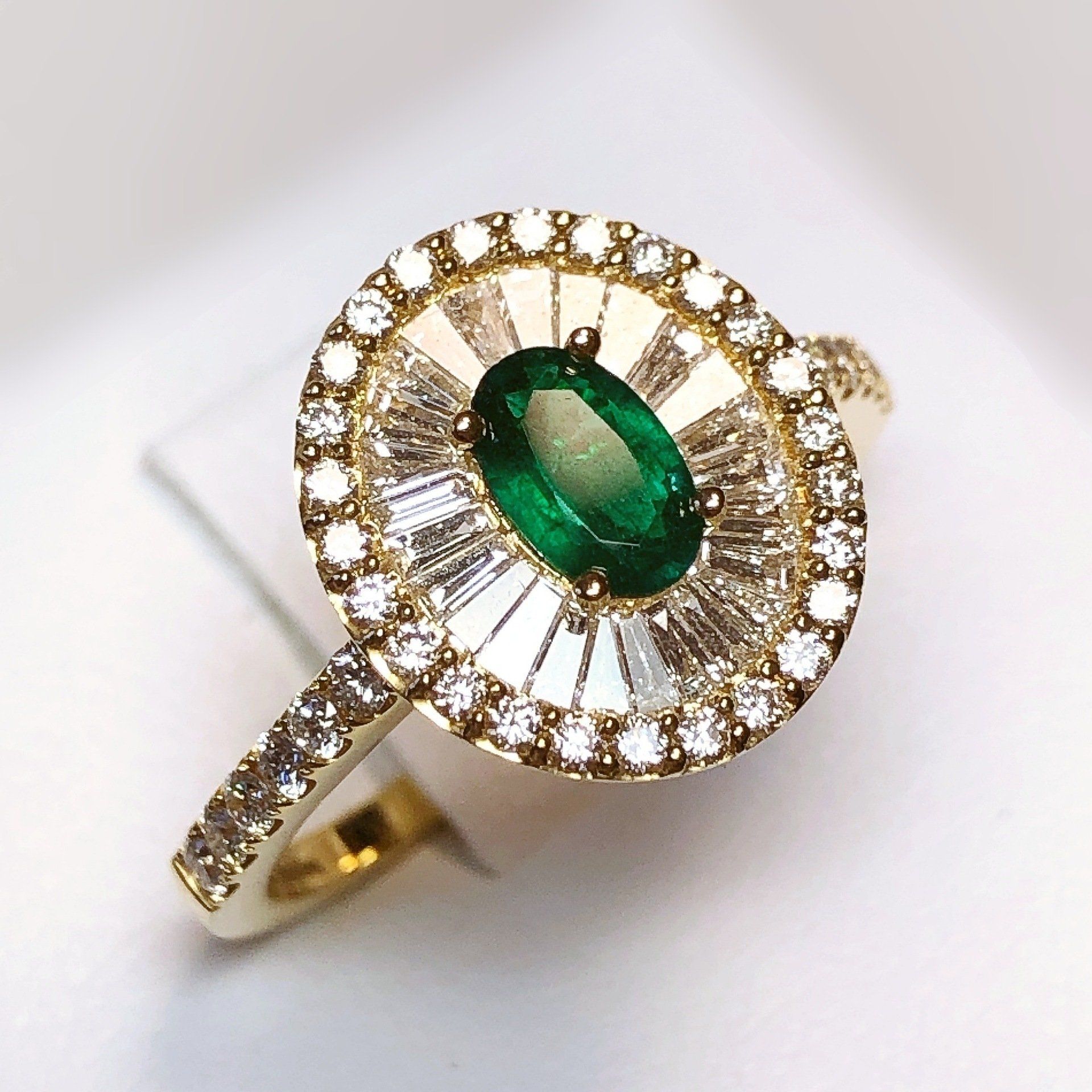 Bague en or jaune 750 millième, sertie d'une émeraude et de diamants.