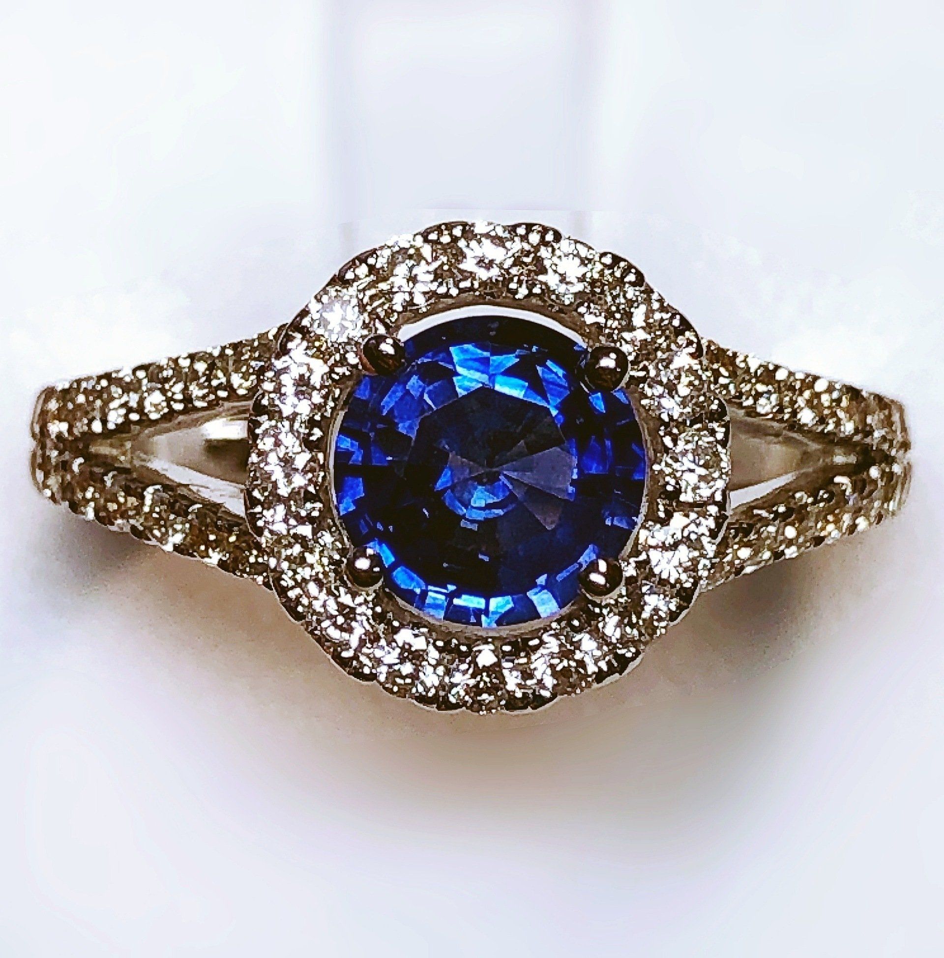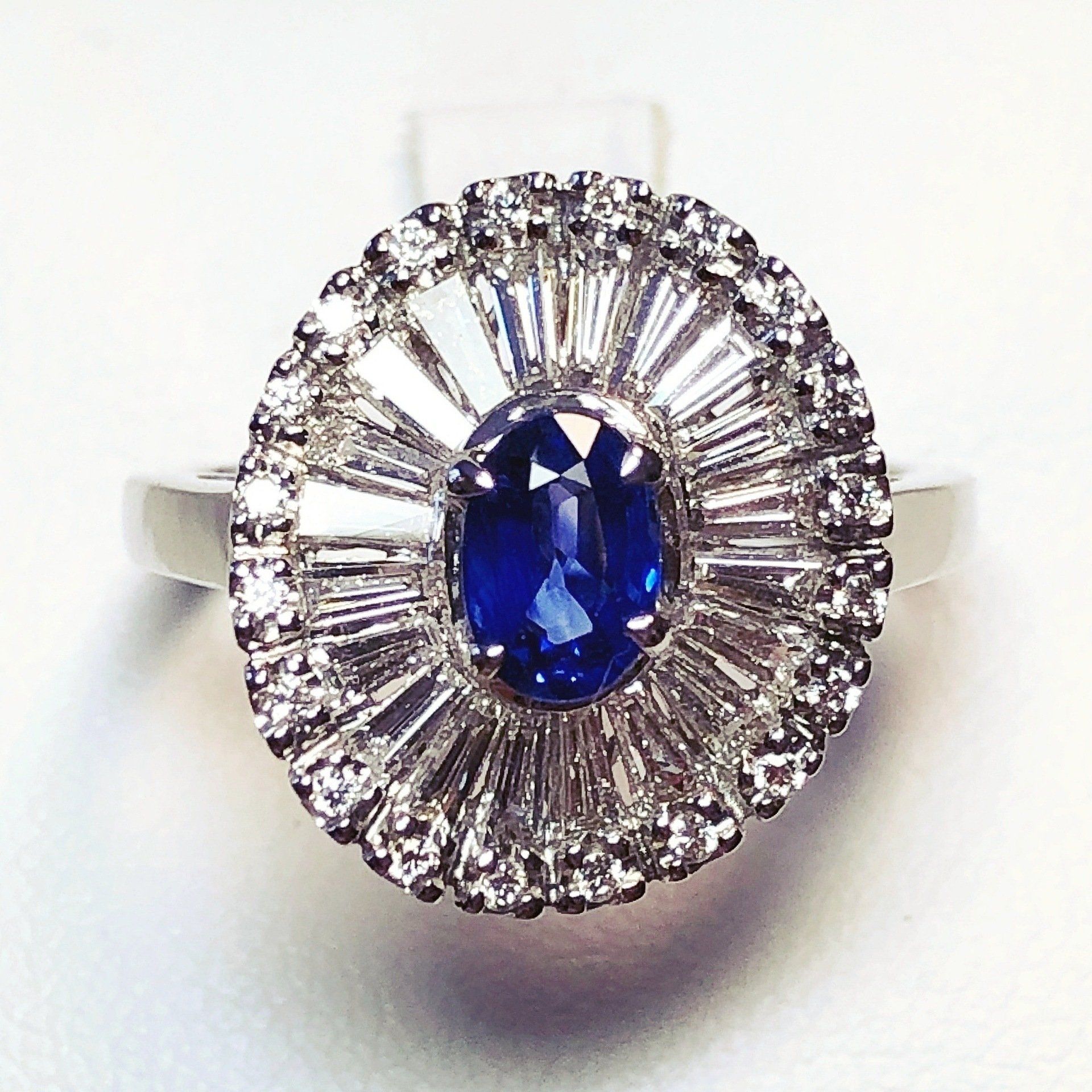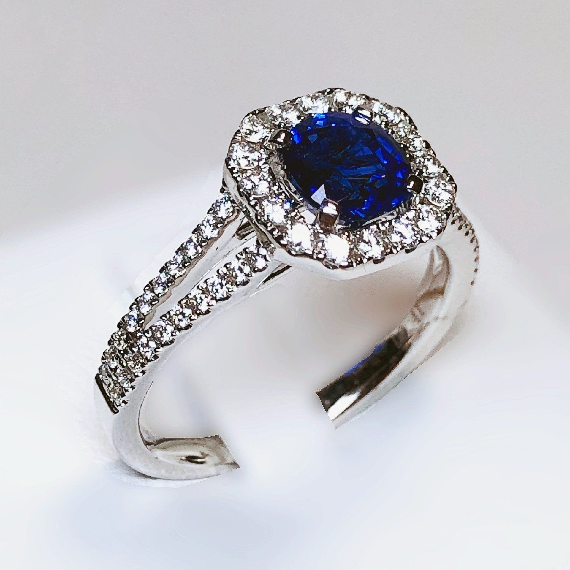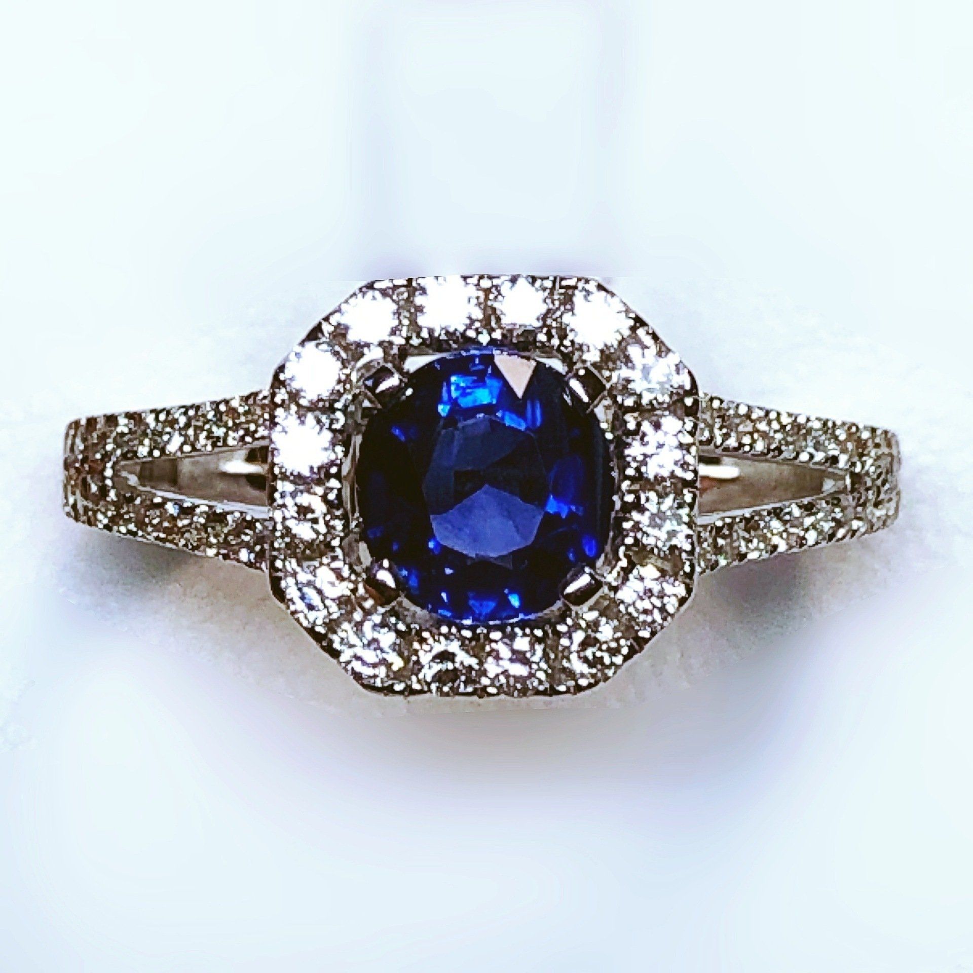 Bague entourage en or blanc 750 millième, sertie d'un magnifique saphir et de diamants.