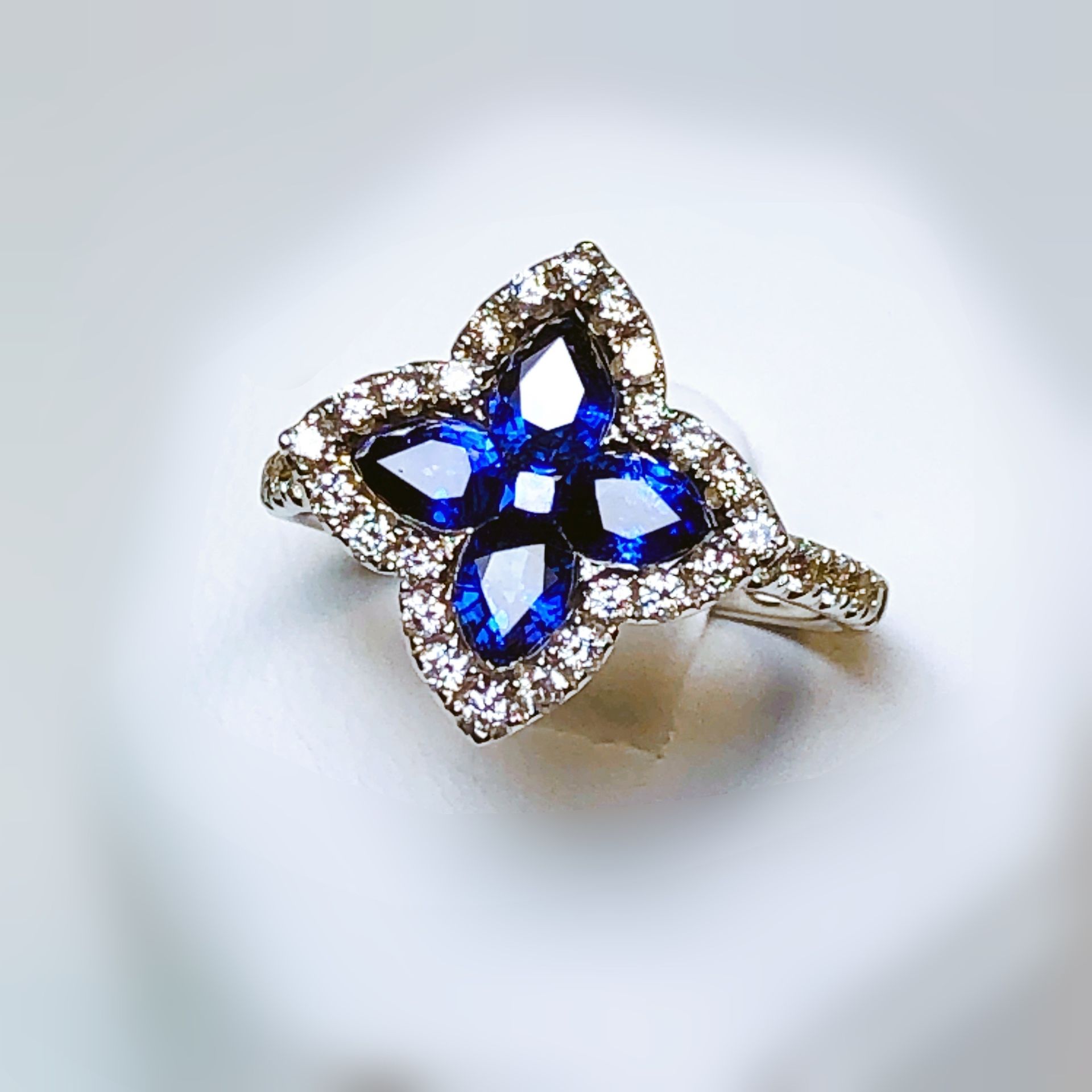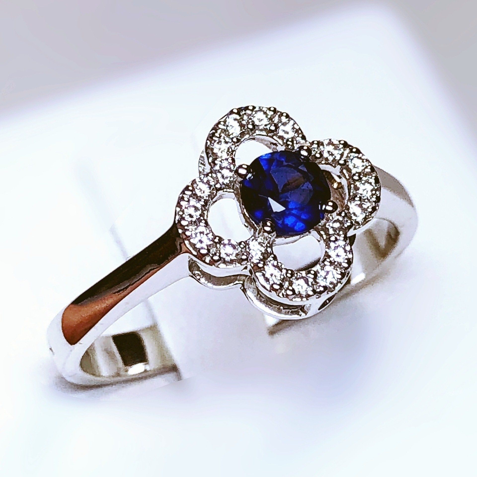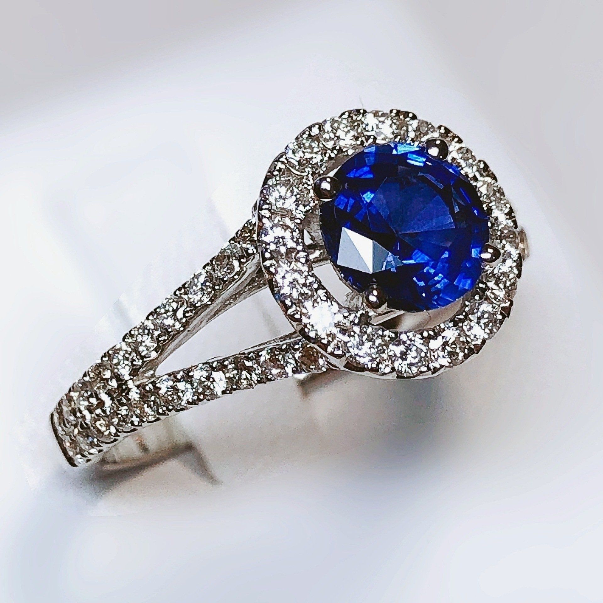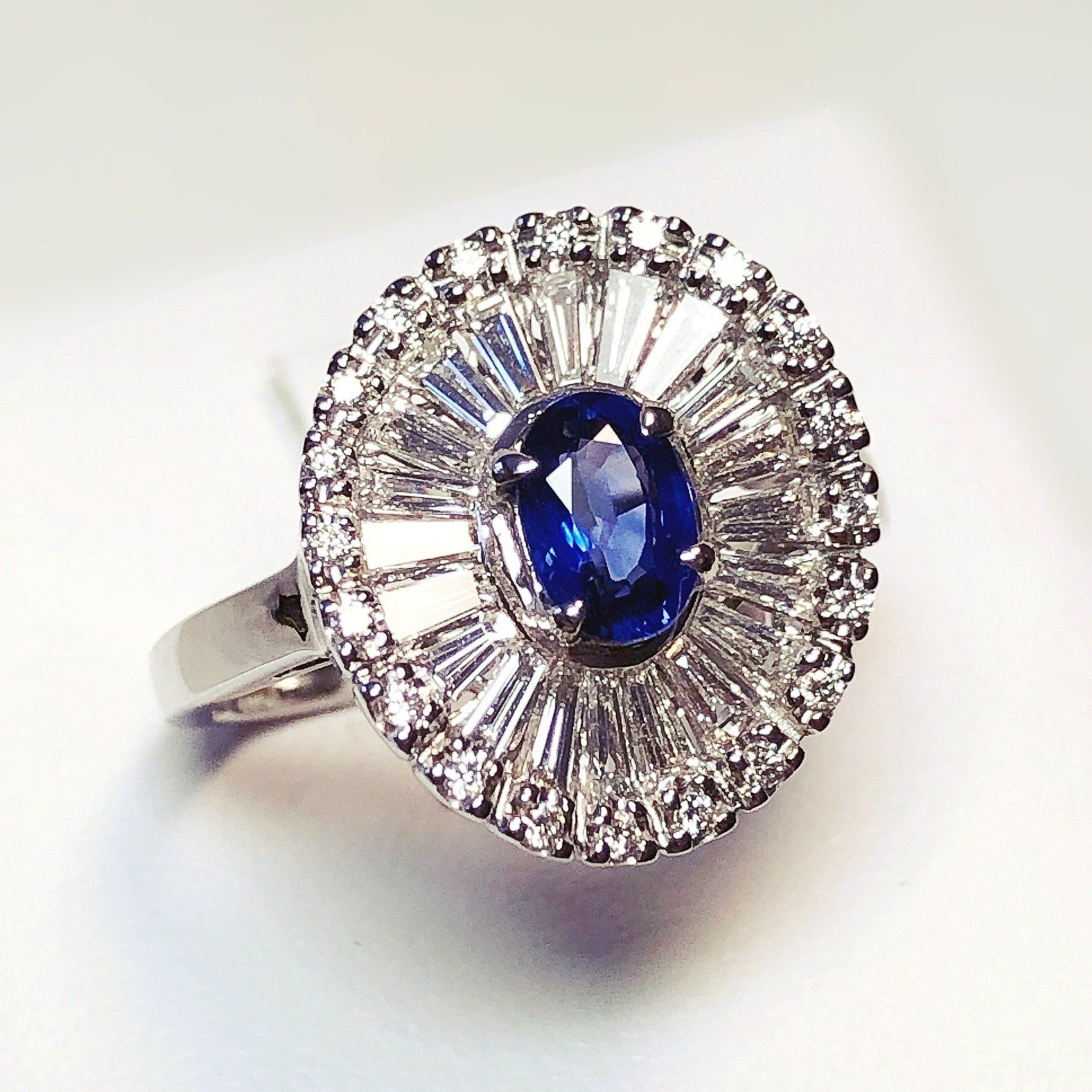 Bague entourage en or blanc 750 millième, sertie d'un magnifique saphir et de diamants.