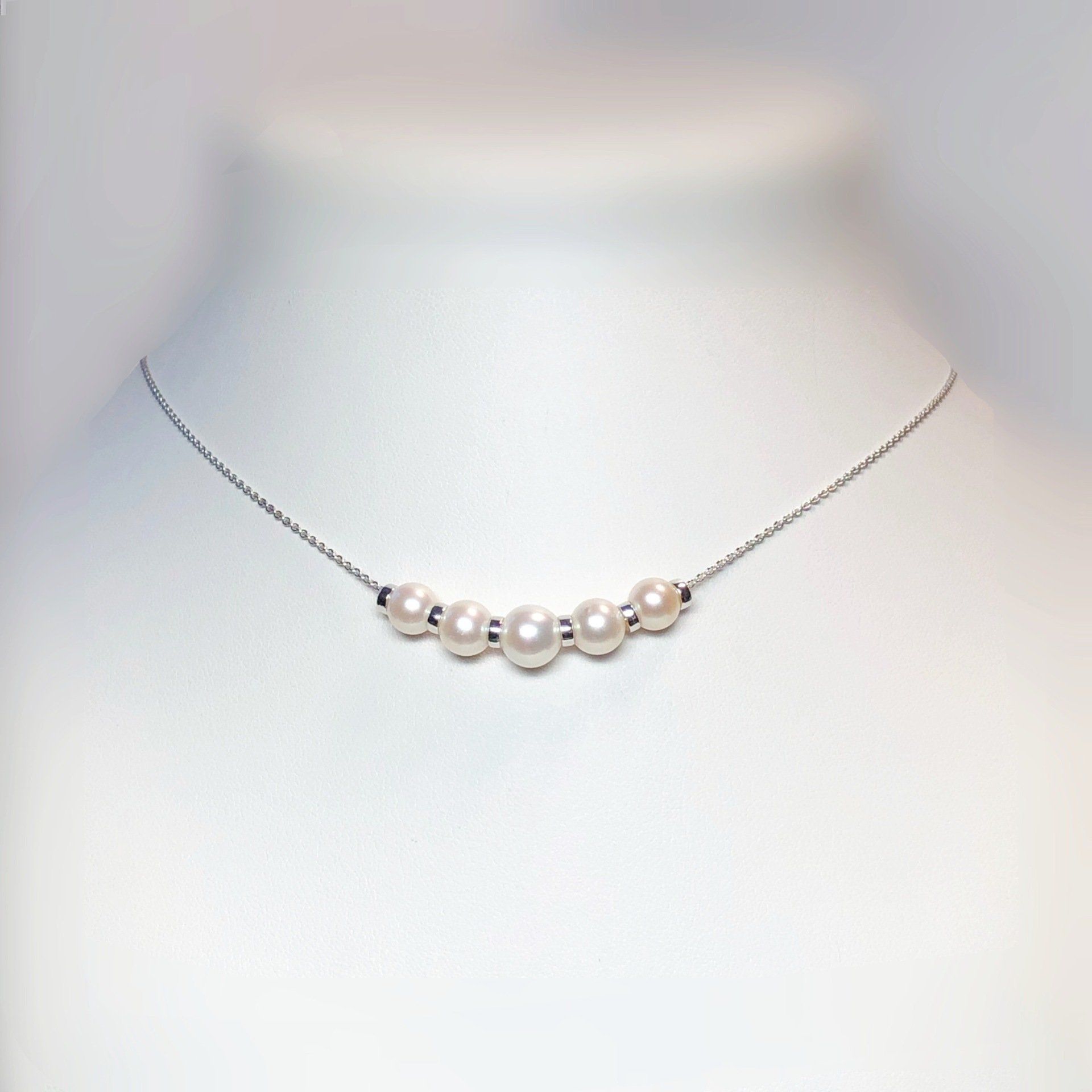 Collier de perles de culture montées sur chaines en or blanc 750 millième avec intercalaires en or blanc 750 millième.