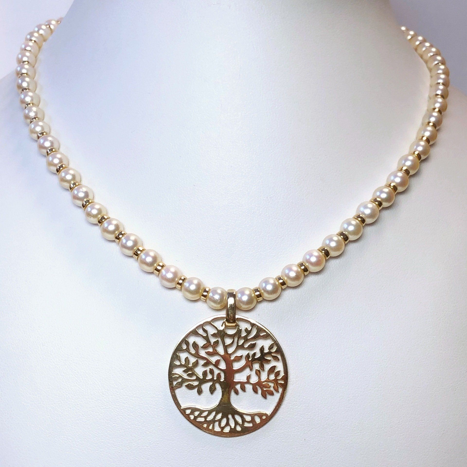Commande client d'un collier de perles de culture à intercalaires en or jaune 750 millième, avec en son centre un pendentif arbre de vie en or jaune 750 millième.