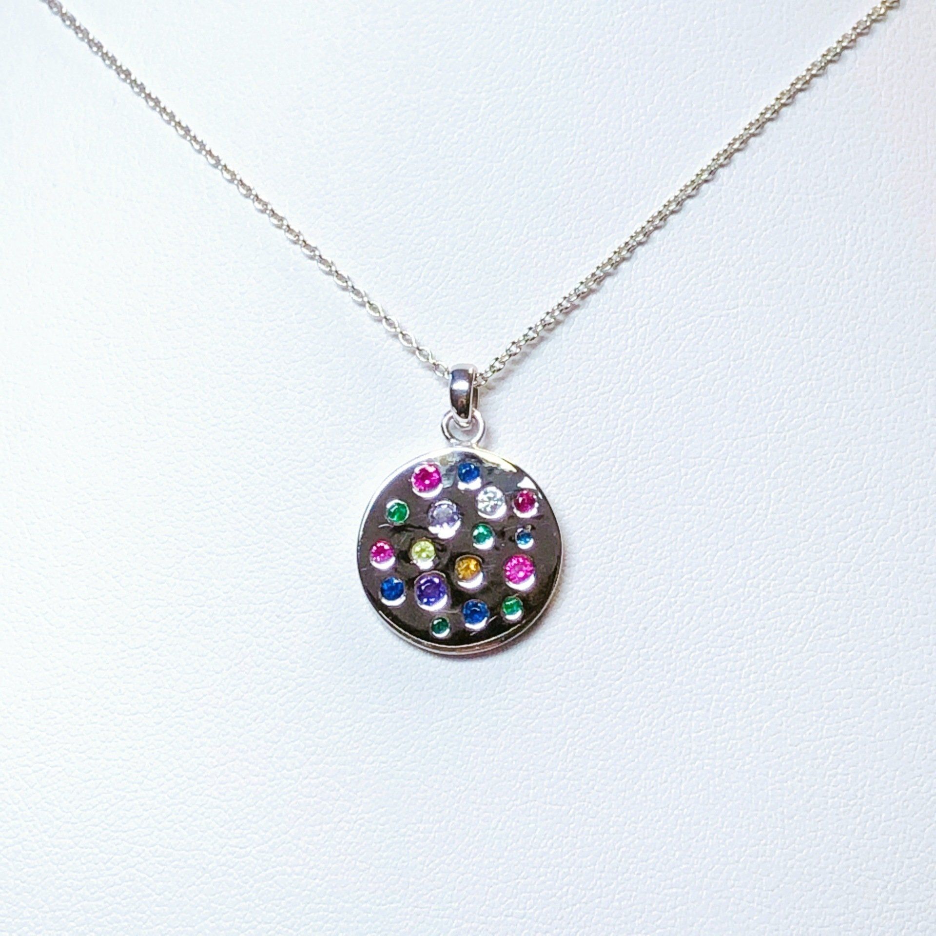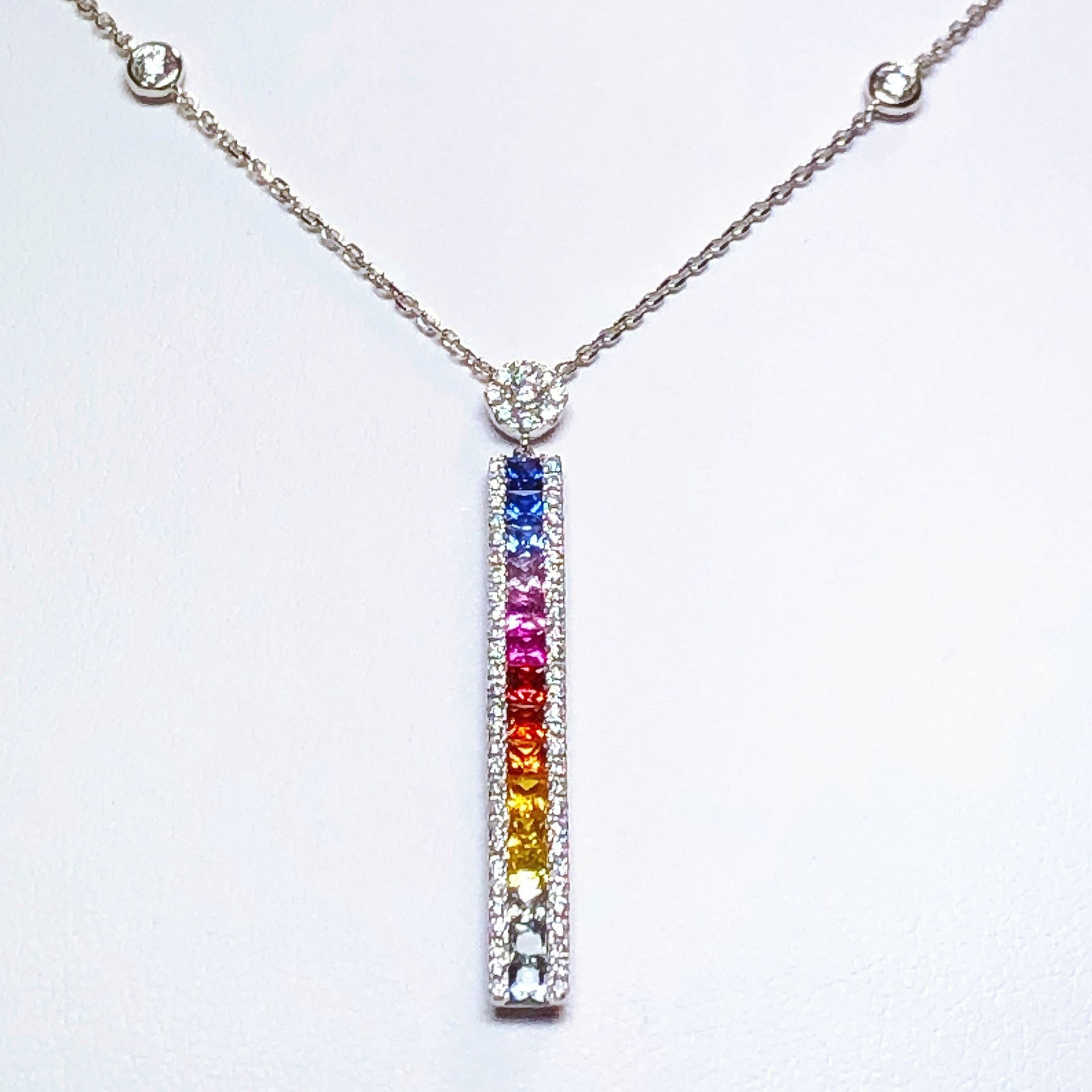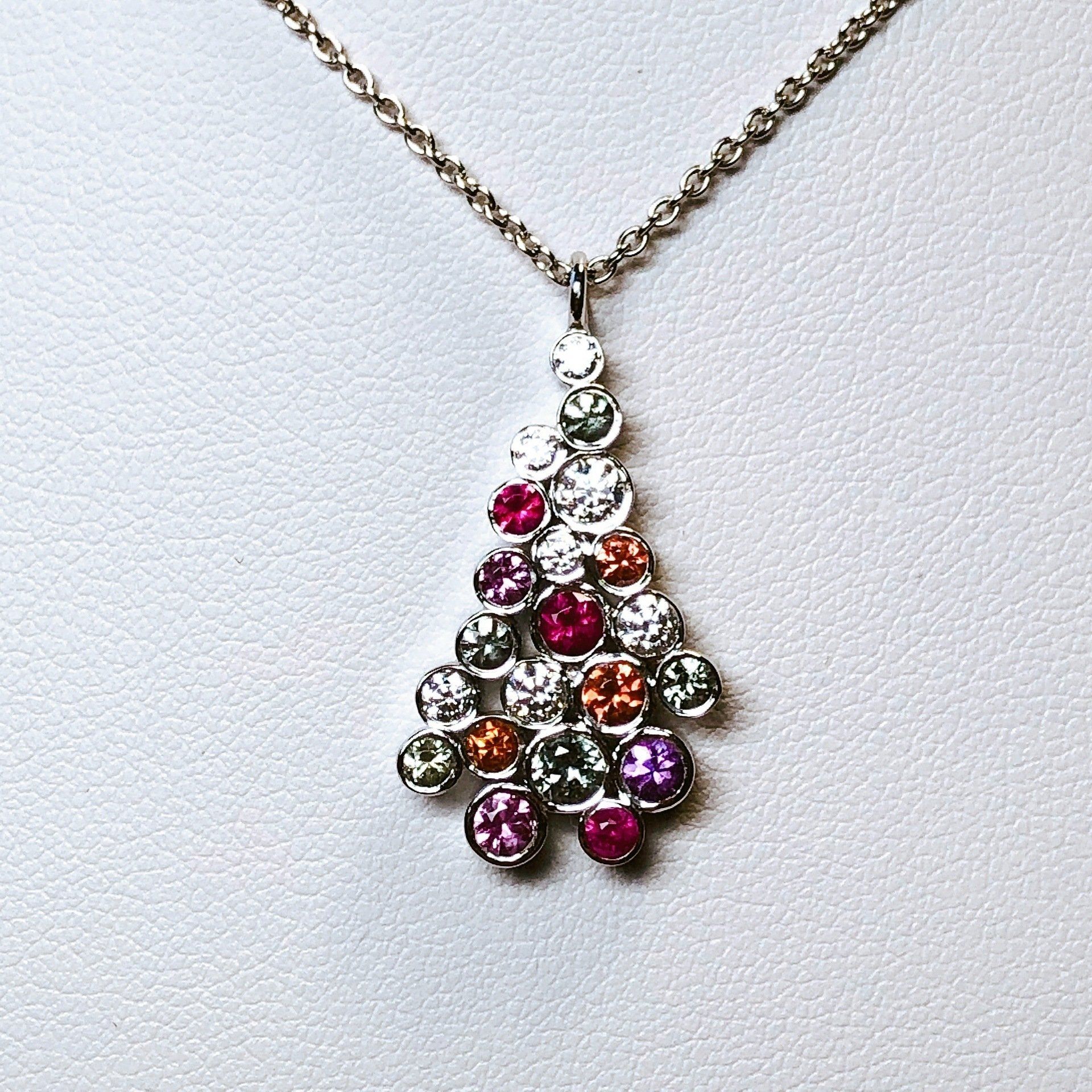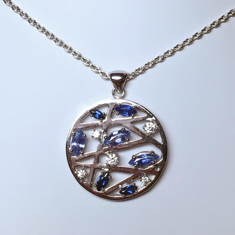 Pendentif en or blanc 750 millième, serti d'oxydes de zirconium et de saphirs.