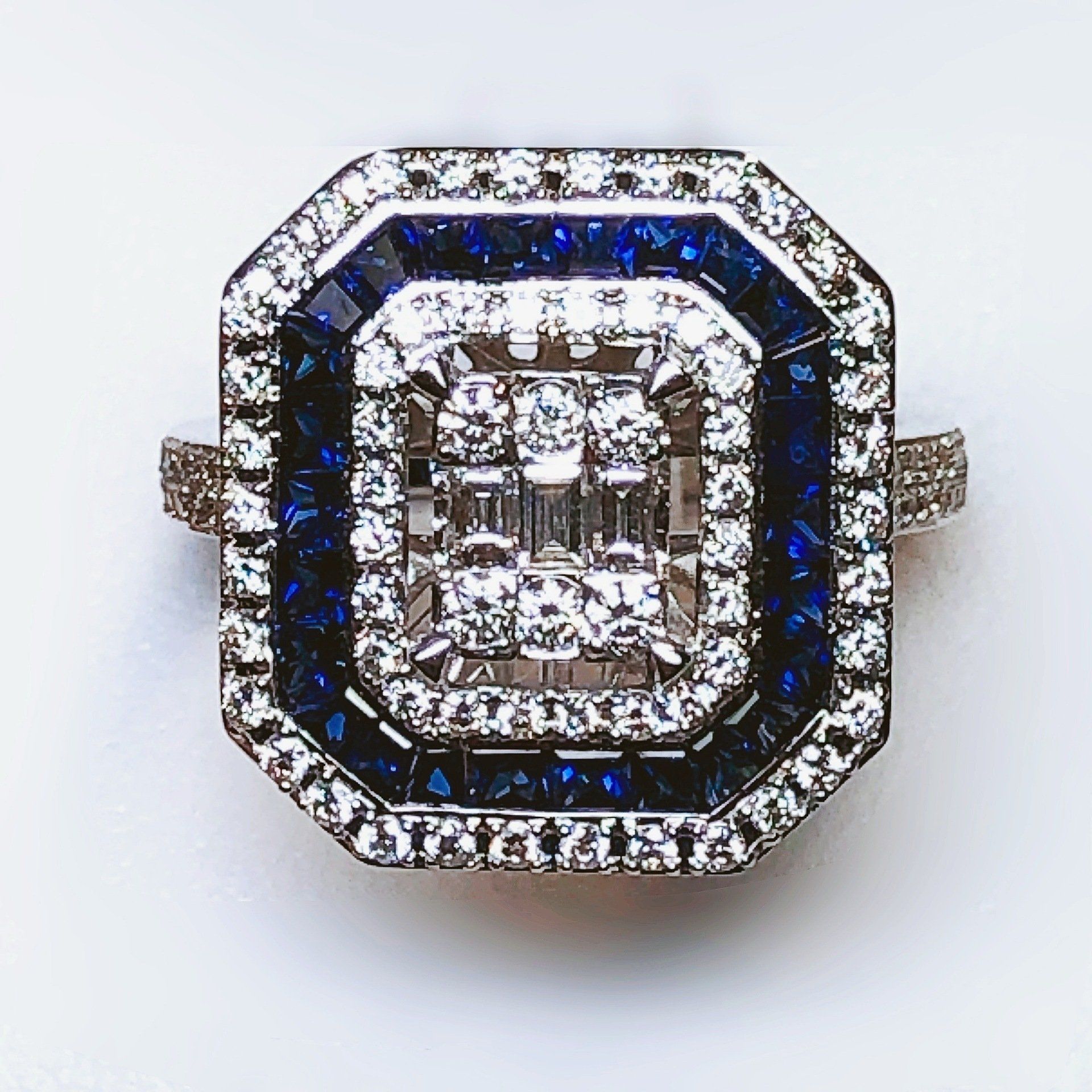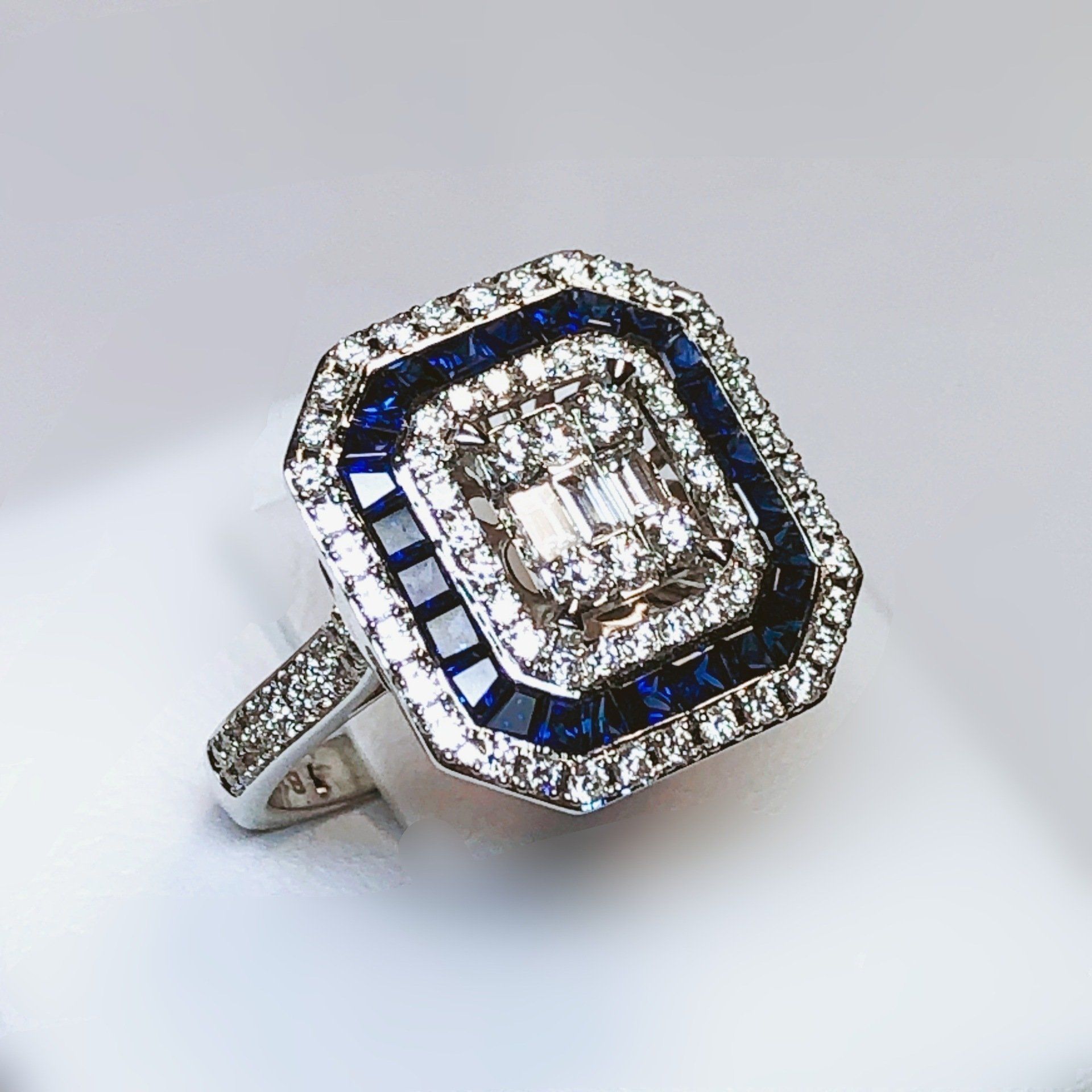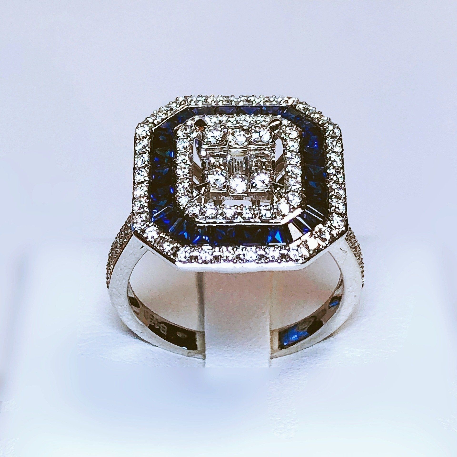 Bague entourage en or blanc 750 millième, sertie de saphirs et de diamants.