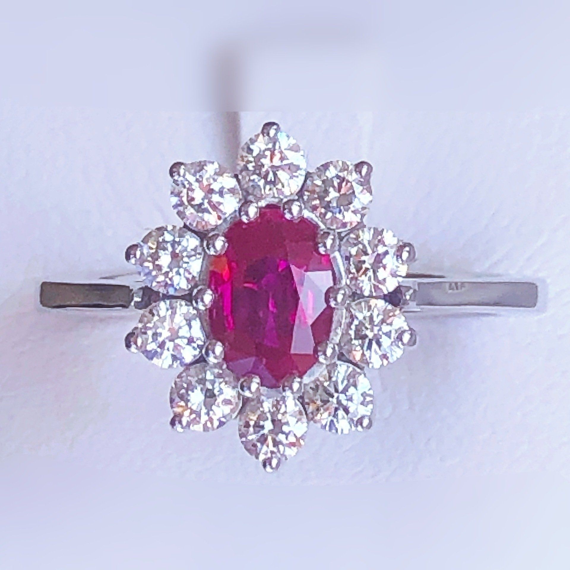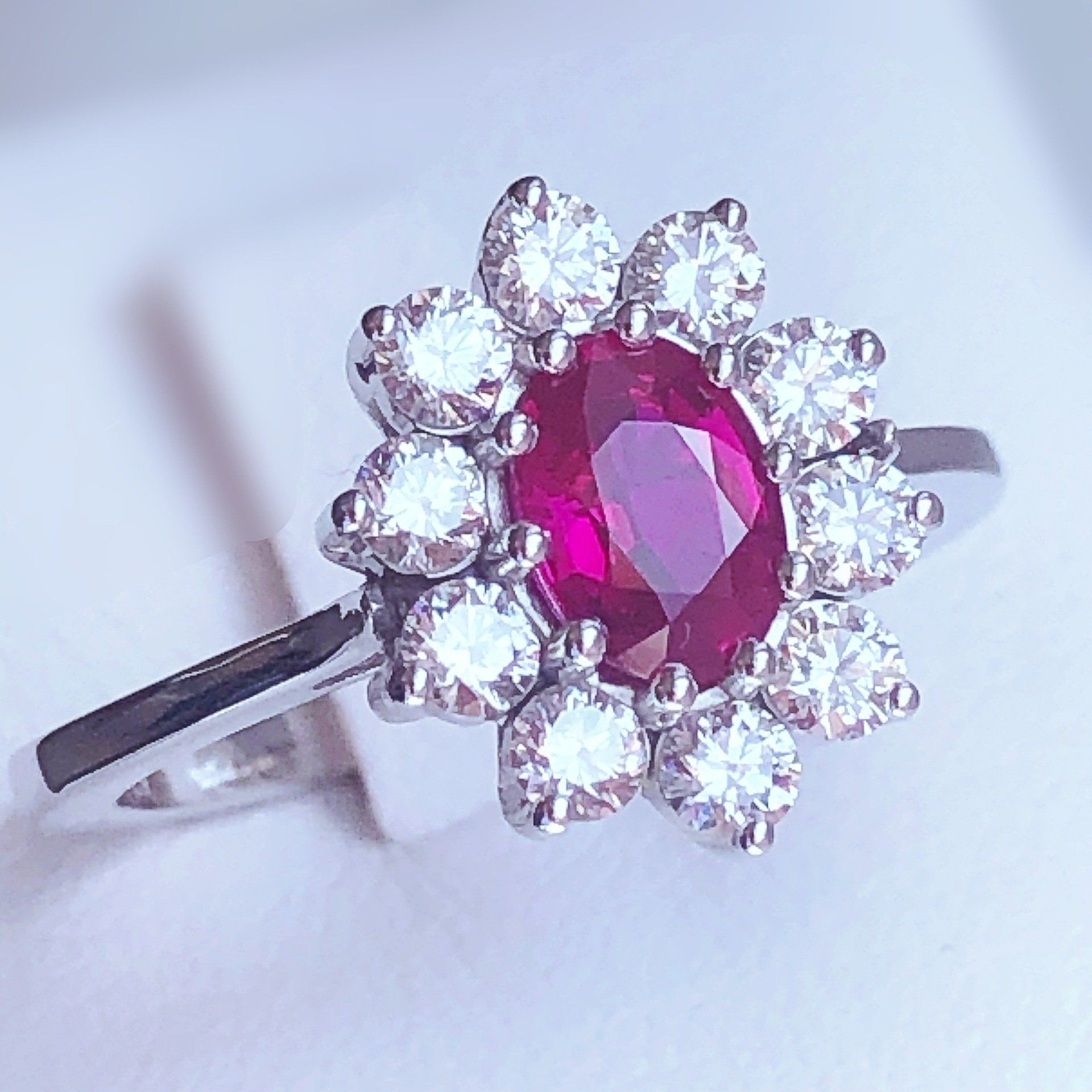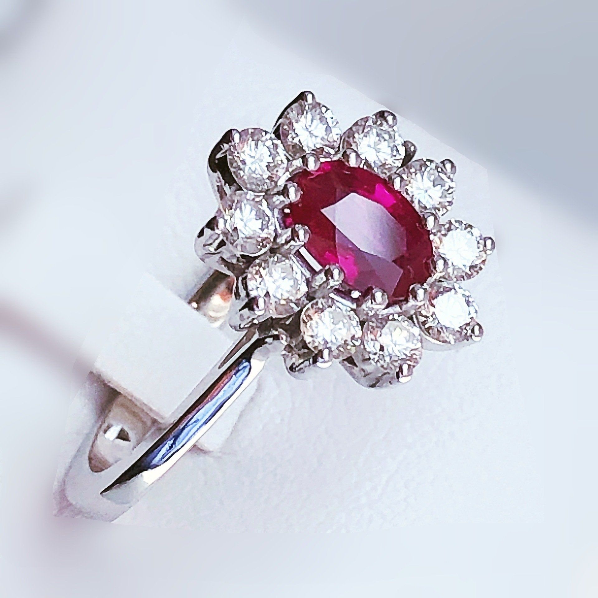 Bague entourage en or blanc 750 millième, sertie d'un rubis et de diamants.